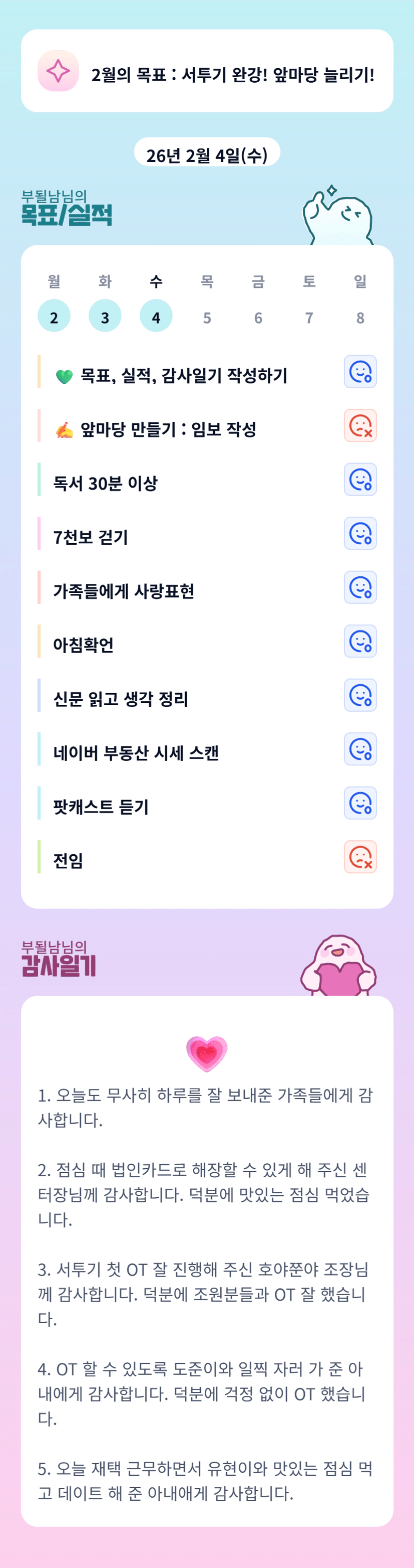 오늘도 부될남님의 하루는 근사하군요! 서투기 들으시는지 이제 알았습니다.. ㅎㅎ 2월 서투기동안 한걸음말고 3걸음 나아가는 부될남님 되시길 기원합니다!!!!!!!