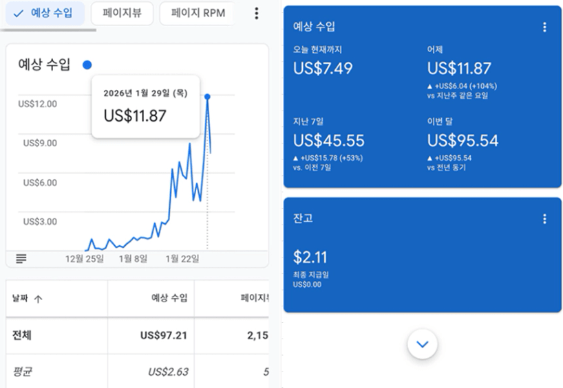 12/25일이 제가 애드센스 승인 받은 시점(기초반 종강 즈음)이고, 그 후 약 한 달동안 100$ 달성했습니다.