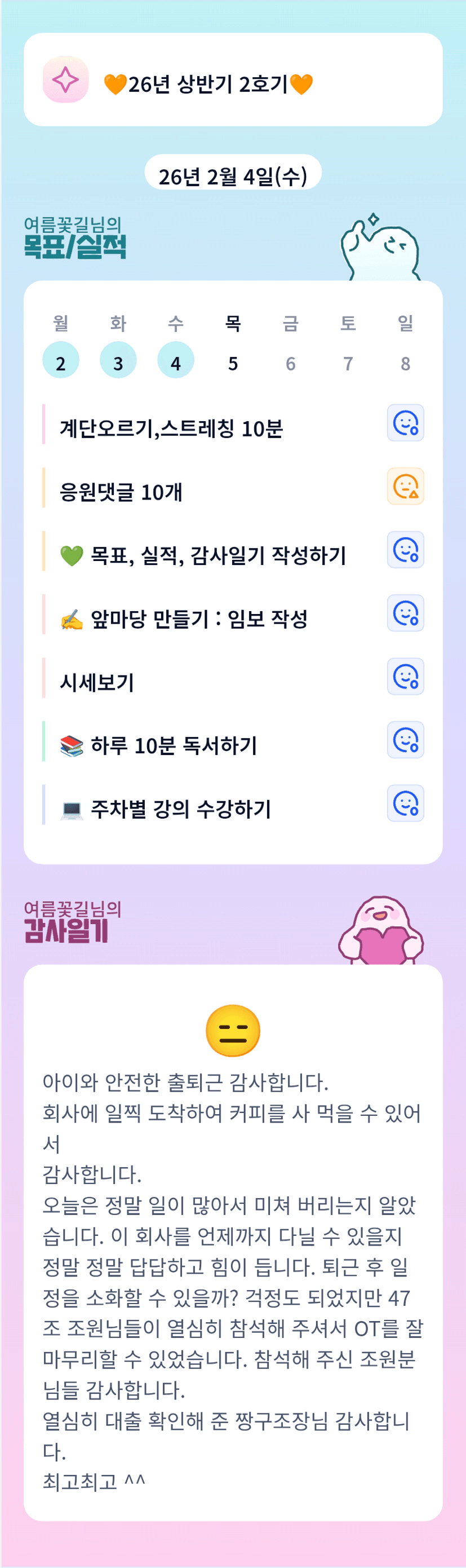 꽃님 오늘 회사 많이 힘들었나보네요.. 얼른 우리 시스템 만들어서, 선택하는 삶을 살아요 :) 가끔은 해야 할 일에 압도되어 너무 힘들 때도 있겠디만, 묵묵히 꾸준히 하시는 꽃님은 다 이겨내실거라 믿습니다. 조원분들과의 OT 고생하셨어요. 이번달, 우리 더 열심히 해봐요