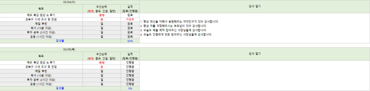 🌻2/5 목표, 2/4 실적 & 감사일기