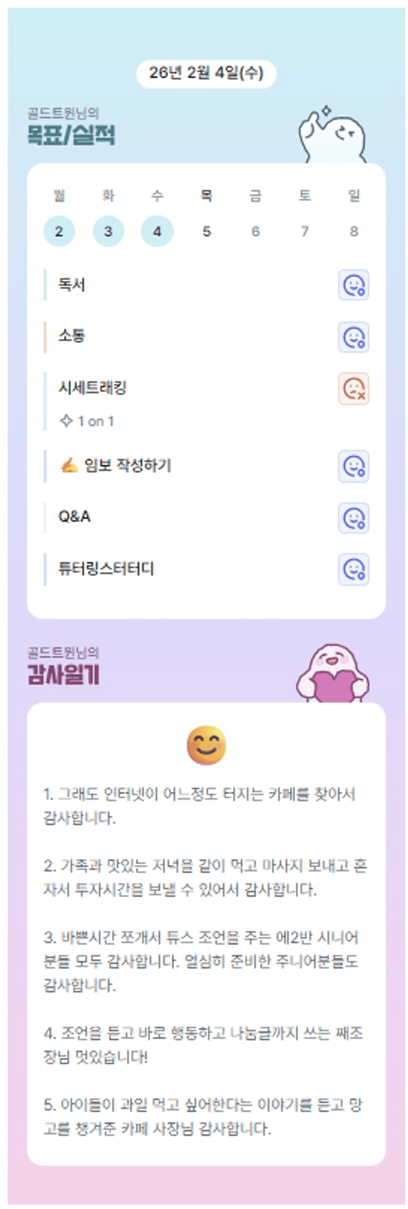 튜터님! 가족분들과 시간을 보내면서도 그 안에서 열정적으로 투자에 몰입하시는 모습! 존경합니다!!! 오늘도 저희 조를 위해 도움 주셔서 감사합니다♡