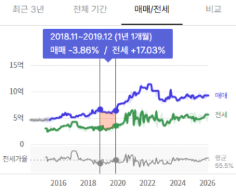 이에 따라서 최근 매매가격 상승한 비율에서 큰 차이를 보이고 있습니다.