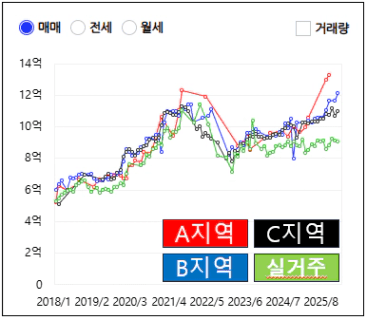 실제 가격을 봐도 A단지의 가격 상승 시점이 가장 빠르고, 전고점도 가장 높고, 반등 후 매매 가격도 가장 높습니다.