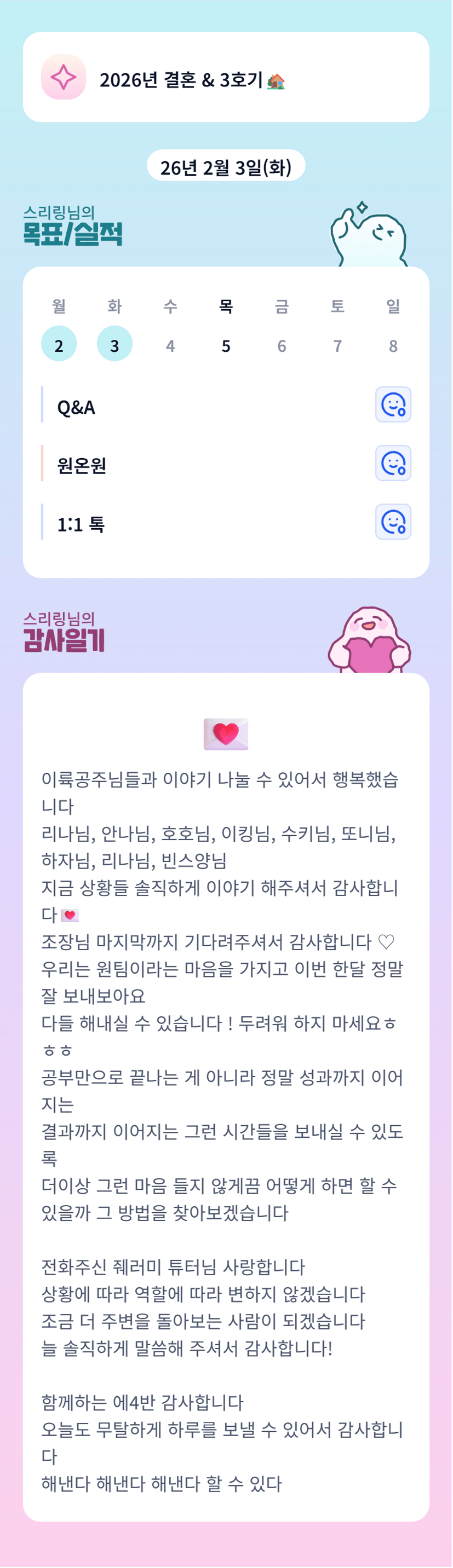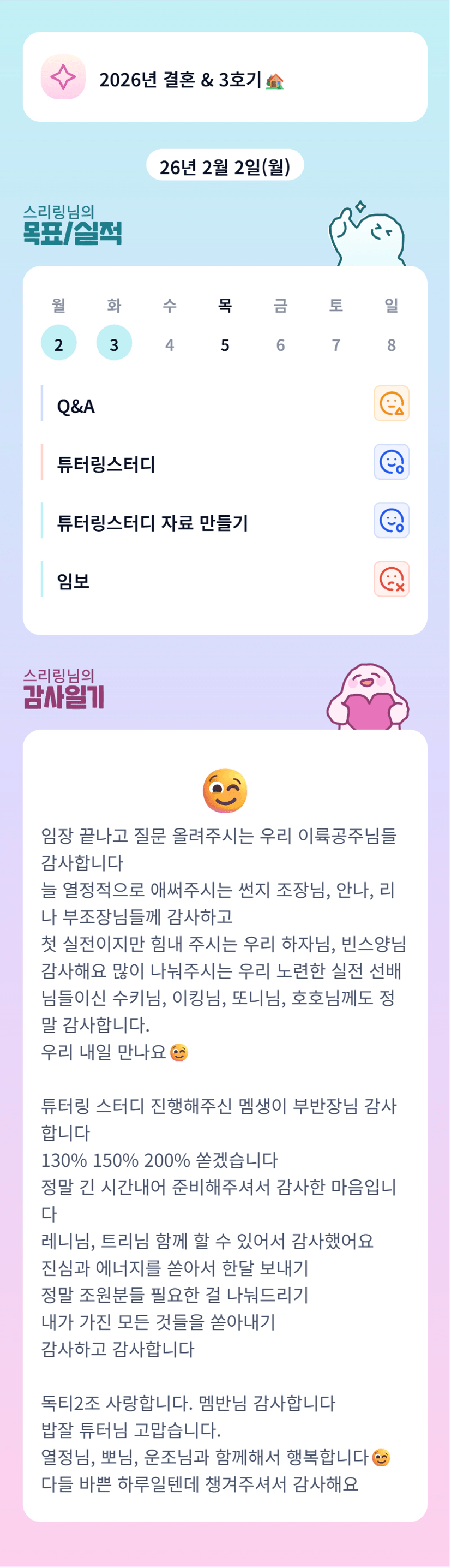 튜터님! 감사일기양이 어마무시... 튜터님의 따스한 마음이 느껴집니다^^♡ 내일부터 다시 정신차려볼게용!!♡ 든든합니다.