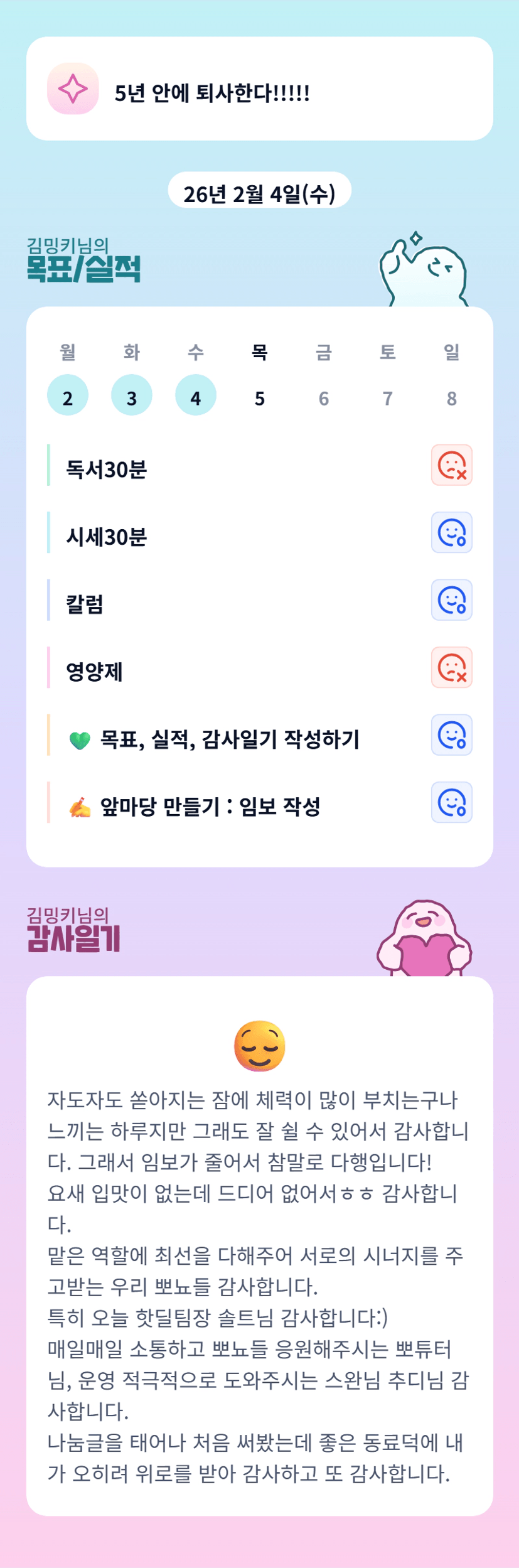 하루하루 성장하고 계시는 밍키님!!😆 역시 이시간까지 달리셨군요!! 저도 요즘 체력이 떨어지는 것 같은데 우이 미리미리 건강도 같이 챙겨요!!🫶 화이팅!!