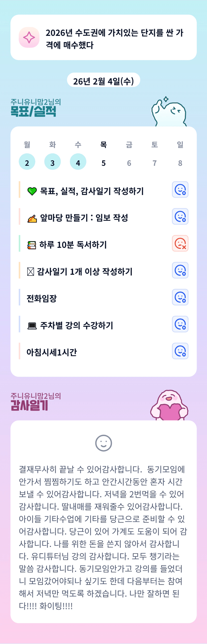 크 진짜 맘님 꼼꼼 계획과 확언 복기까지 넘넘 멋지세요♡ 저도 1강 마지막 부분 듣는데 정말 안챙기고 있는 친구들이 생각나더라구요 ㅎㅎㅎㅎㅎ 다음에는 밥만 먹기>_< 그 시간까지 몰입하신 맘님 넘넘 멋지십니다♡ 고생하셨습니다♡♡♡ 함께 목요팅이에요♡