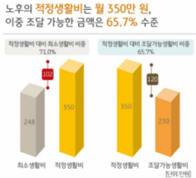 하지만 적정 생활비(월 350만 원) 대비 준비된 금액은 65.7%에 불과합니다. 소득이 끊기는 시점을 생각했을 때 은퇴를 60세라고 생각한다면 30년 정도 버티기 위해서는 최소한 10억이 필요합니다.