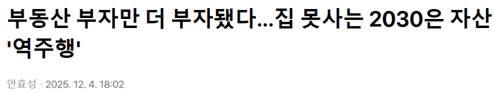 국가데이터처ㆍ금융감독원ㆍ한국은행의 ‘2025년 가계금융복지조사’를 요약한 기사를 살펴보면 최근 자산 시장의 상승으로 "벌어졌다"는 말로는 표현하기 어려울 정도로 그 차이는 더 급격하게 벌어졌음을 알 수 있습니다.