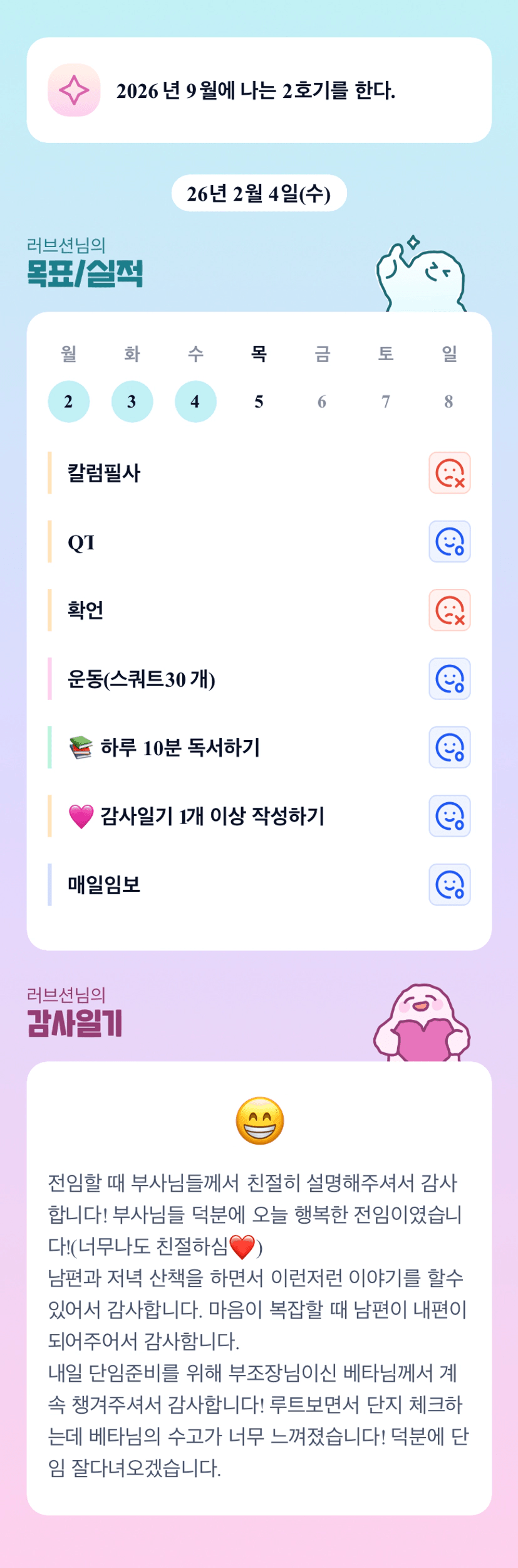 션님 올해 2호기 확언 꼭 이루시길 응원합니다!!! 오늘도 화이팅!!!