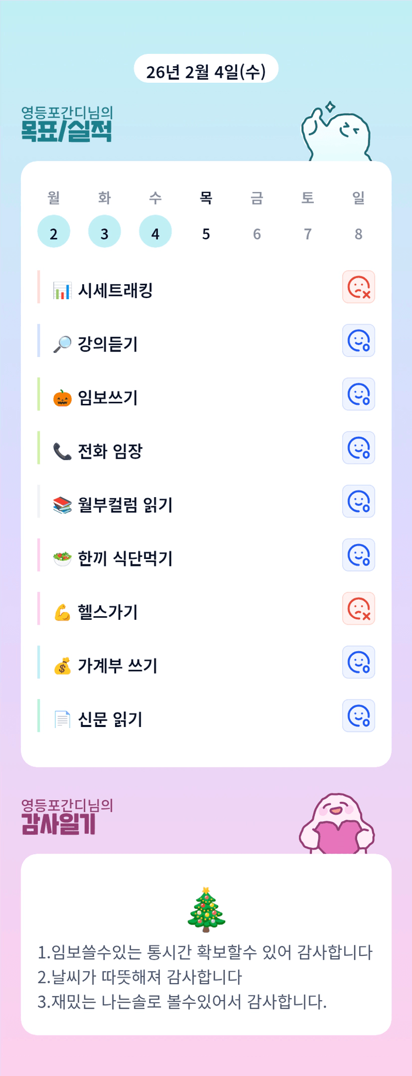 나는쏠로보기ㅎㅎㅎㅎ 소확행!! 간디님 ~~~ 오늘 하루도 몸과 마음 잘 챙기며 알찬 하루 만들어가보아용!! 홧팅!