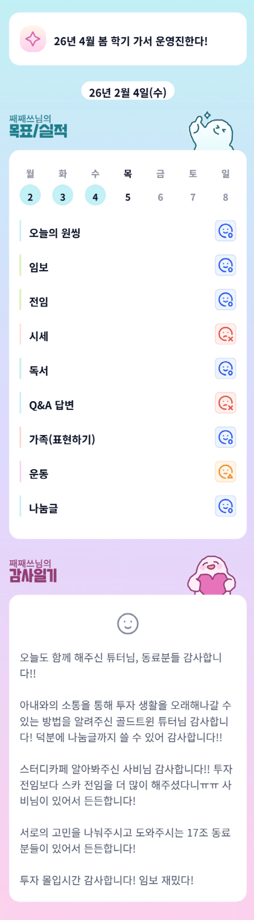 +) 감일 추가: 몸이 아프심에도 불구하고 조장님들께 연락주신 주노님 감사합니다!!! 건강 빨리 나으시길 바래요ㅠㅠ 조장님들을 위해 도움주시고 마음써주시는 주노님이 계셔서 든든합니다!!