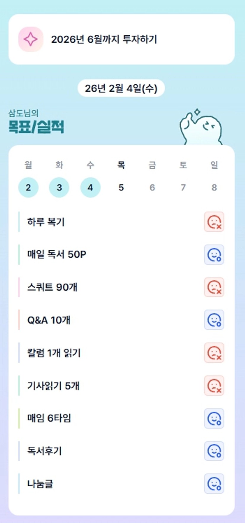 4. 1월 계획 우여곡절 끝에 100% 달성할 수 있음에 감사합니다. 반장님과 공이님의 레버리지로 겨우 완료할 수 있음에 감사합니다. 앞으로 더욱 앞서나가도록 노력하겠습니다. 그리고, 매임 하는 날 다른 루틴이 많이 무너짐을 기억하며 이동 시간이나 30분 일찍일어나야 함을 알게되어 감사합니다.