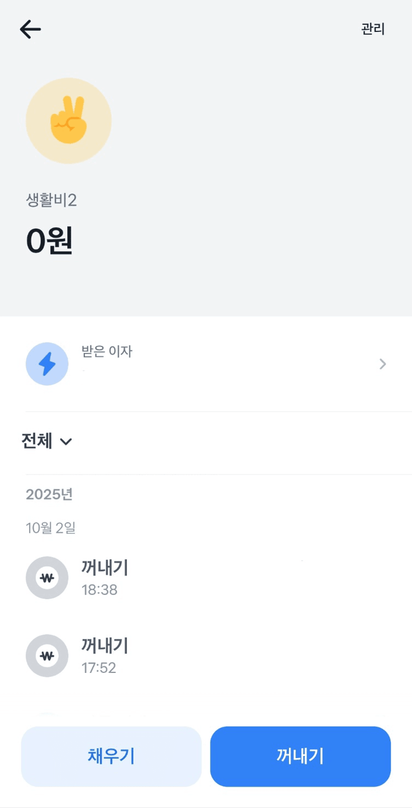 | Sub1 | 생활비2 | 메인 통장과 연결 되어 채우기/빼기만 가능 |