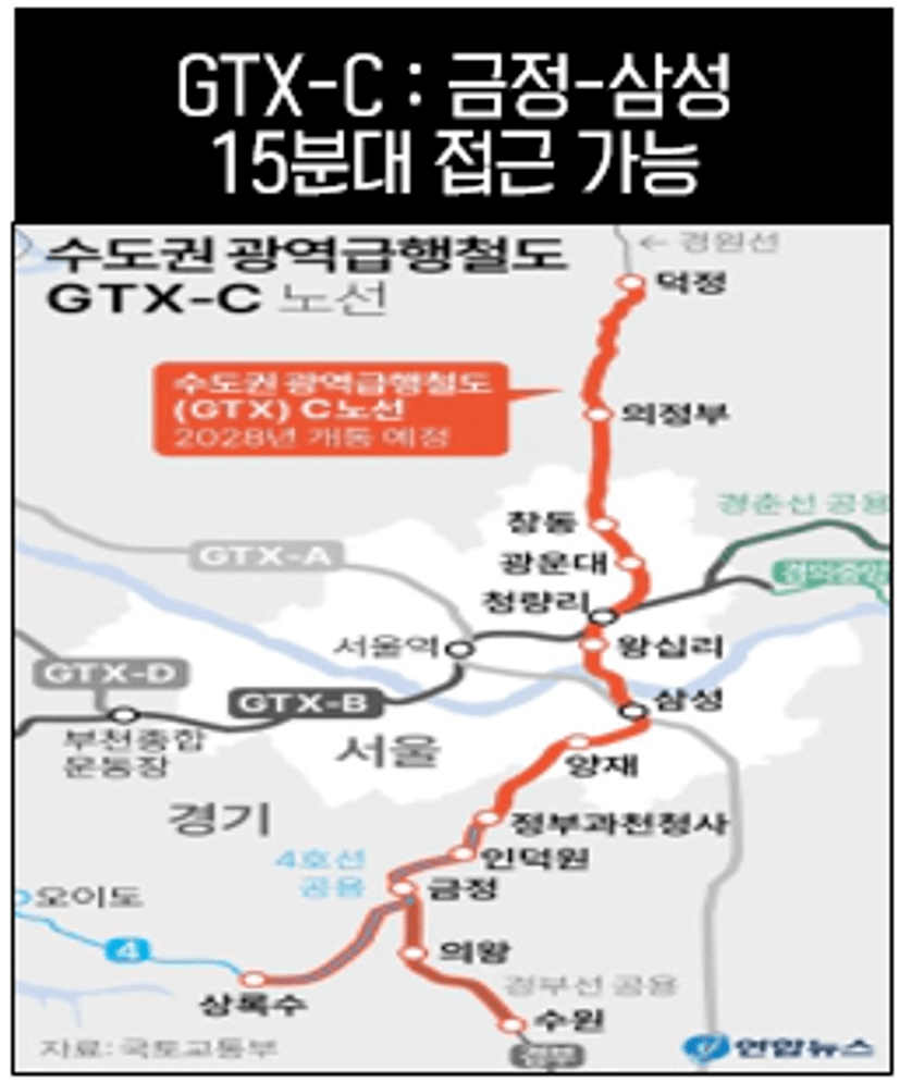 • GTX-C의 압도적 파급력: 금정역에 GTX-C가 들어서면 삼성역까지 단 14분대에 주파하게 됩니다.
