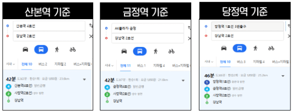 • 4호선(산본역/금정역): 사당역을 거쳐 교대, 강남역까지 약 45~50분 내외로 진입할 수 있습니다.