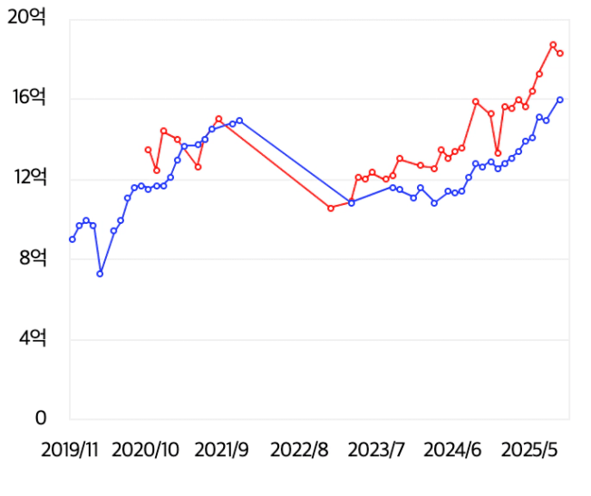 빨강색은 해당 지역의 대장 신축 대단지다. 파랑색은 해당지역의 재건축 단지다. 사업성은 중상위권이고, 속도는 중하위권이다. 빨강색은 24평이고, 파랑색은 27평이다. 이 파랑색27평은 34평 배정받을 수 있는 순번이고, 34평을 배정 받으려면 분담금의 규모는 4억대로 예상된다.그러면 한번 생각해보자. 현재 16억으로 미래 더 신축의 34평을 예약하는 것이다. 그리고 분담금 5억은 나중에 입주시에 들어갈 확률이 높다. 총21억에 34평을 매수하는 것이다. 주담대를 6억 받을 경우 10억의 투자금으로 예약및 실거주를 할수 있다. 참고로 빨강색의 34평은 현재 25억 정도에 거래되었다.