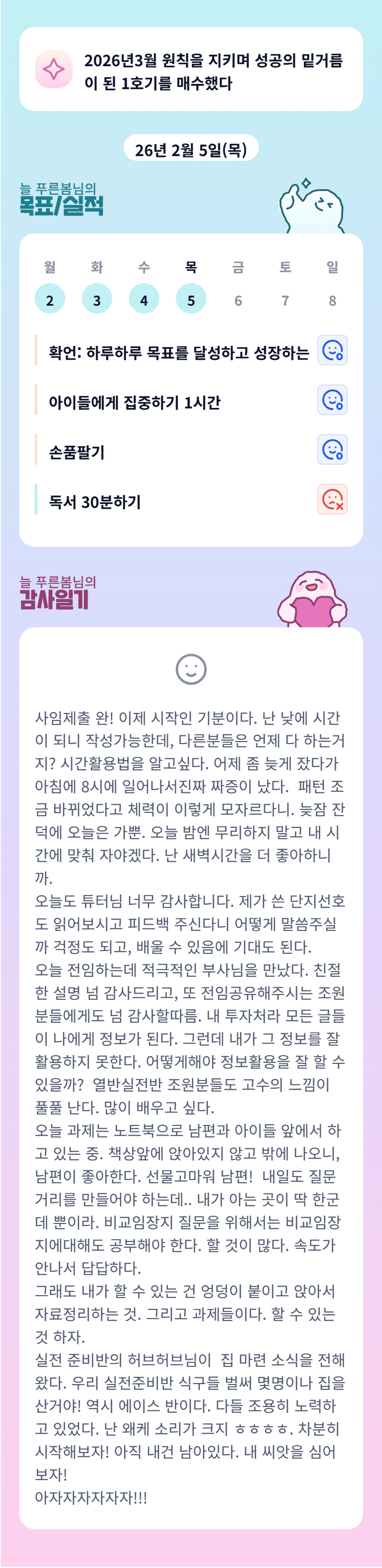 봄님 방학때 방학숙제 벼락치기로 제출하듯이 시간이 많으면 많을수록 더 활용하지 못하는 경우가 오히려 많을 수도 있는건데, 봄님은 진짜 부지런하신것 같아요! 그 많은걸 다 해내시는 봄님 보며 자극받습니다ㅎㅎ 오늘도 고생많으셨습니다.