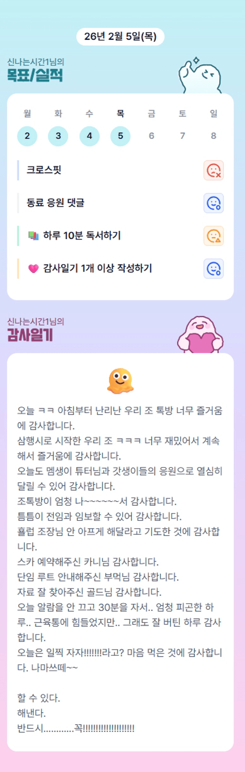 시간님!! 힘든 하루 보내셨네요🥺🥺 이 또한 지나가리라!! 매일 조금씩 빠이팅예요!!💛