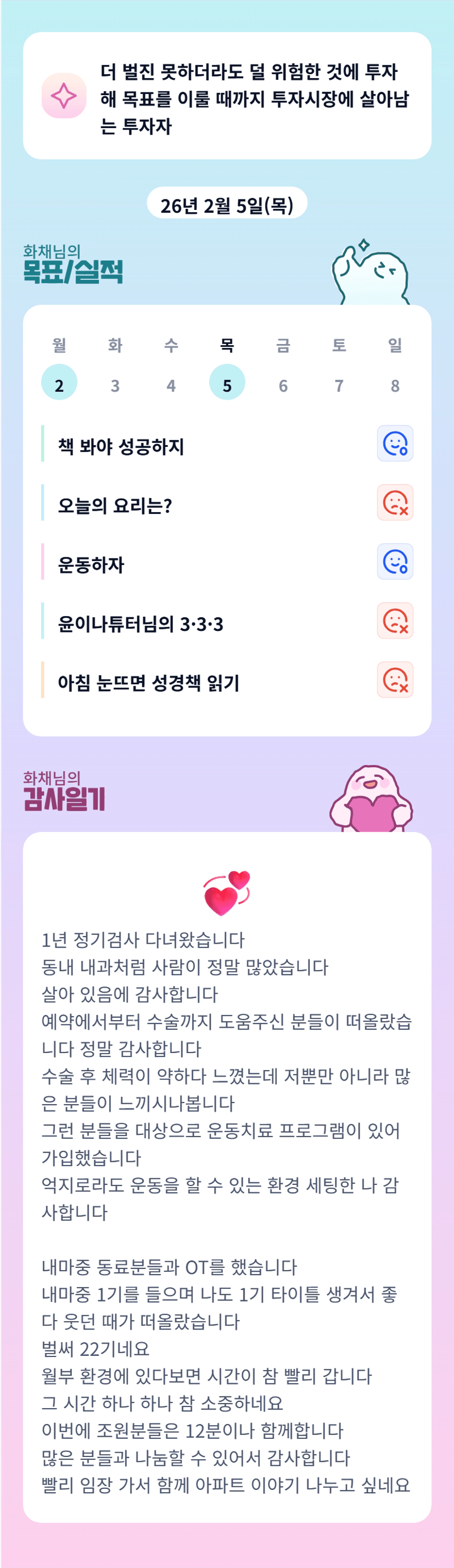 병원갈때마다 저도 건강함에 감사함을 느끼는데 화채님 건강 잘 챙기시고 우리 오래오래 월부에서 봐요 내마중 화이팅