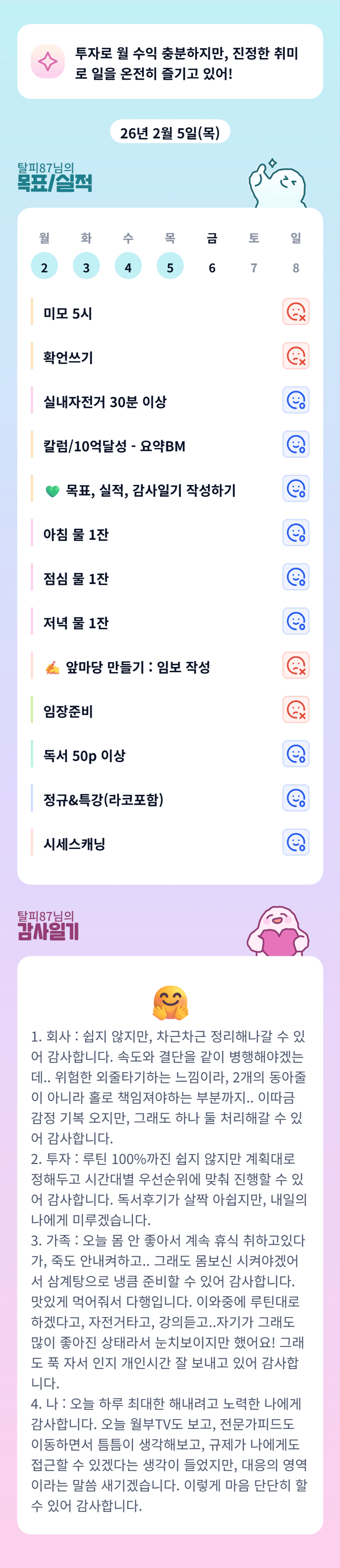 하루하루 할일을 지켜내는 모습 대단하셔요 오늘도 고생 하셨습니다!