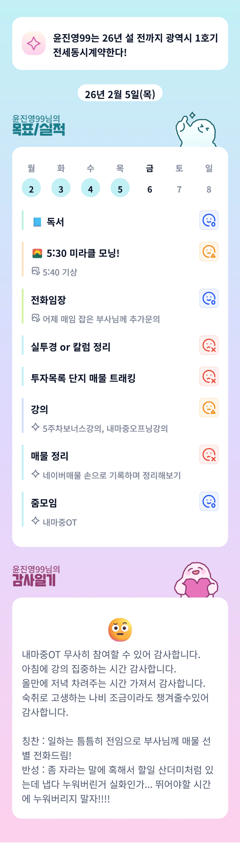 윤진영님 미라클모닝실천하시면서 아침부터 강의들으시고 부지런한 삶을 살고 계시는군요!! 멋지십니다👍 1호기 달성도 응원합니다 🤗