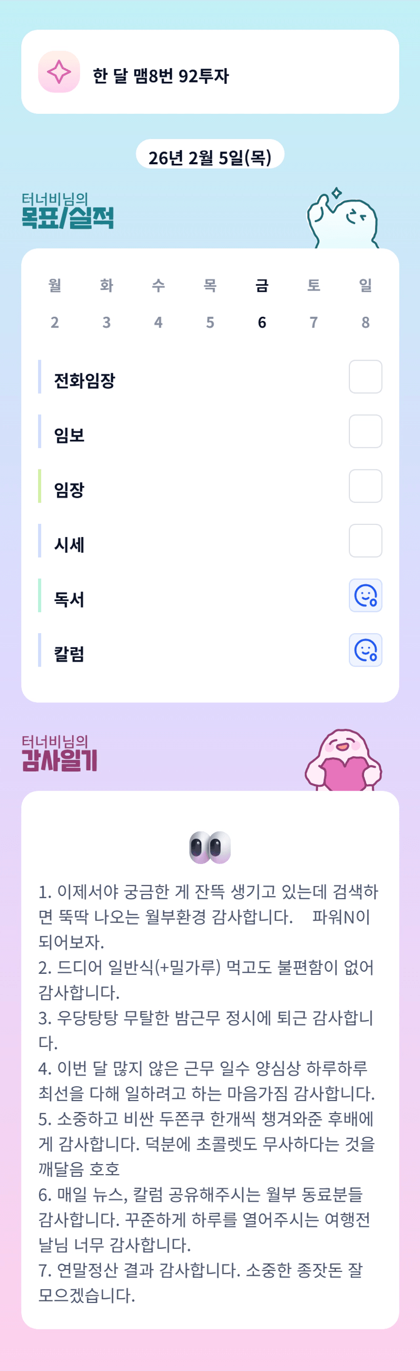 터너비님 건강이 좋지 않으셨나요? ㅠㅠ 건강 잘 챙기시고 항상 힘내세요 홧팅!!