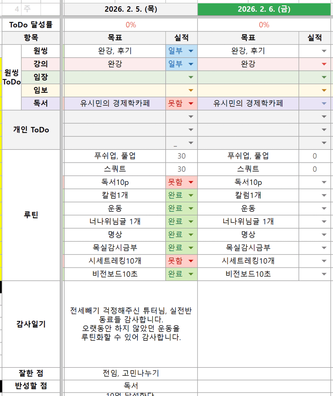 나는 건강한 사람이다.나는 부단히 노력하는 성실한 사람이다.나는 2026년 앞마당 10개 늘린다.나는 2027년 4호기 투자하고, 순자산 10억 달성한다.나는 2029년 5호기 투자한다.꾸준함은 성공의 최고 덕목이다. 나는 꾸준히해서 2035년 30억 부자가 된다.나 우가행은 해내는 사람이다.나는 한다.나는 해낸다.나는 반드시 된다.
