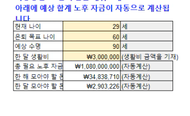 엑셀표를 하나씩 하나씩 채워가는데 노후를 위해 저금해야할 금액들을 보면서 놀랐고