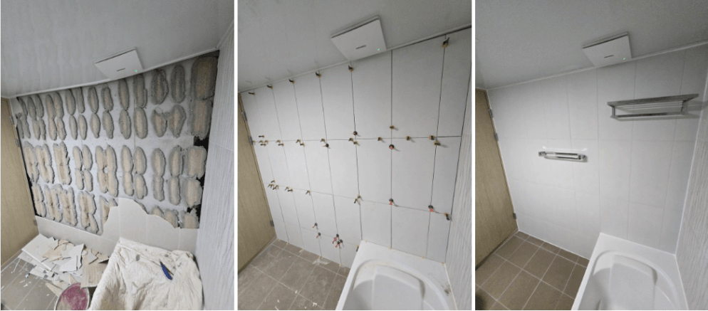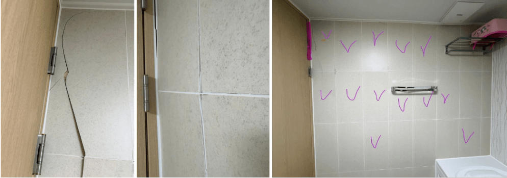 문 뒤쪽 타일이 크게 깨졌고 잔잔한 균열도 많더라고요.