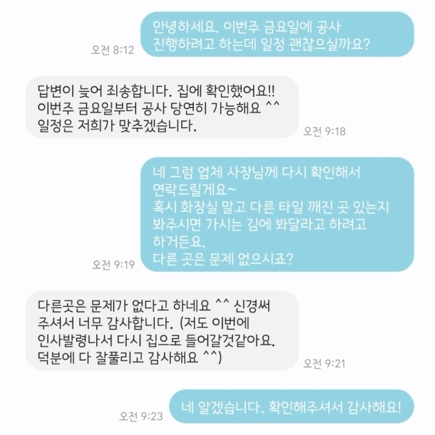 화요일에 연락을 받고, 수요일에 업체를 선정해 금요일에 시공까지 마쳤습니다.