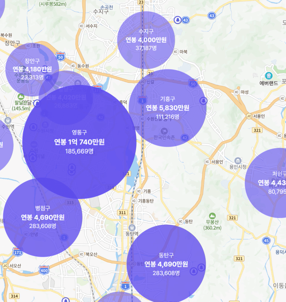 실제로 연봉데이터를 보면 수지구, 동탄구보다 월등히 높은 모습을 볼 수 있습니다.