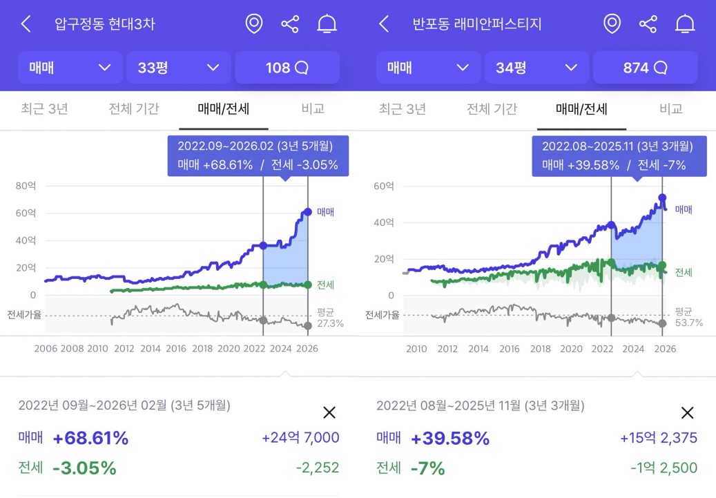 23년부터 무섭게 오르며 전고점 이상으로 가는 고가시장의 아파트들은 22년 전고점 대비 40~70%가 올랐습니다.