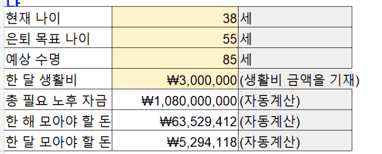 B. 한 해 모아야 할 돈: A. 총 필요 노후 자금 ÷ (2. 은퇴 목표 나이 - 1. 현재 나이)
