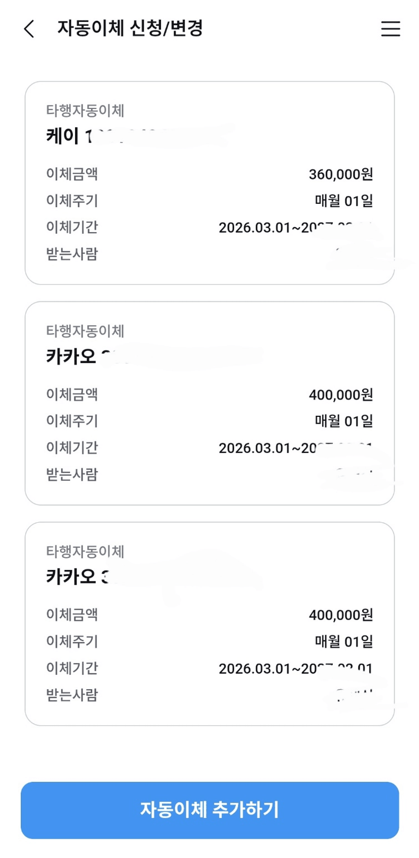 현재 제 스마트뱅킹 화면을 보시면 생활비, 활동비, 주거비 항목에 대한 자동이체 신청을 모두 마친 상태예요. ✅ 아직 개설하지 못한 추가 계좌들도 조만간 다 정리해서 나머지 항목까지 자동이체 세팅을 끝낼 예정입니다.
