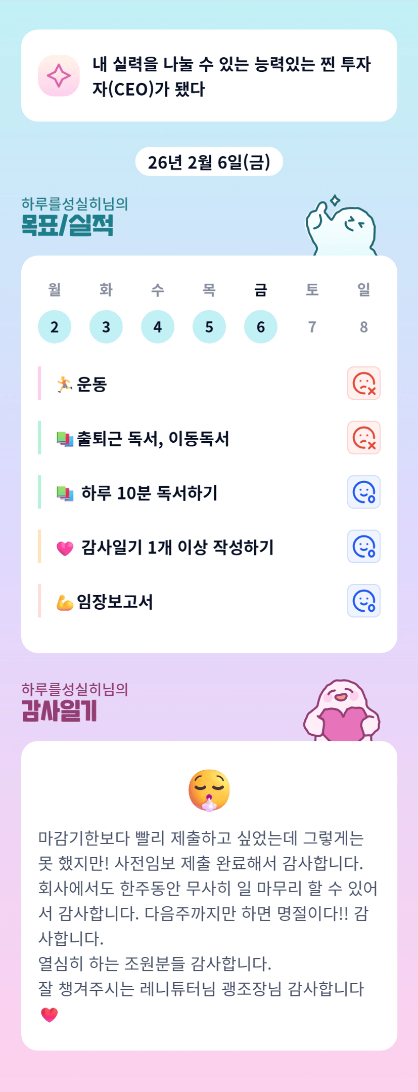 요즘 회사일도 빡시고, 실전반도 빡세쥬~ 저도 ㅠㅠㅎ 너무 공감되네욤.. 근데 너무 잘하고 있어서, 멋져유~👍 오늘 단임 고생많았어욤!! 낼 또만나요 > < ㅎㅎㅎ