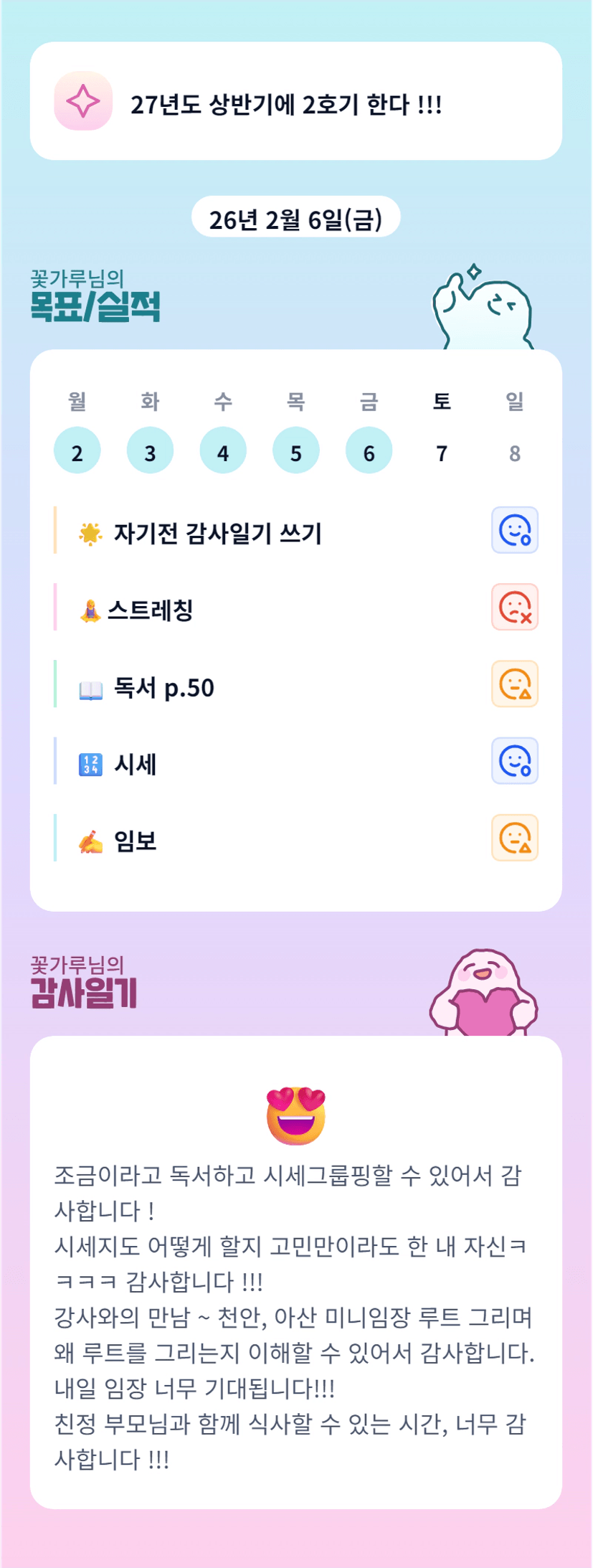 호오옹 벌써 시세그룹핑까지!! 미니임장 정말 많이 배울 수 있는 좋은 기회같아요 ㅎㅎ 다시한번 축하드리고 조심히 다녀오세요🙌 친정 부모님과 식사까지 기쁜날 한가득이네요 가루님☺️ 오늘도 고생하셨구요 내일도 화이팅입니다 ㅎㅎㅎ
