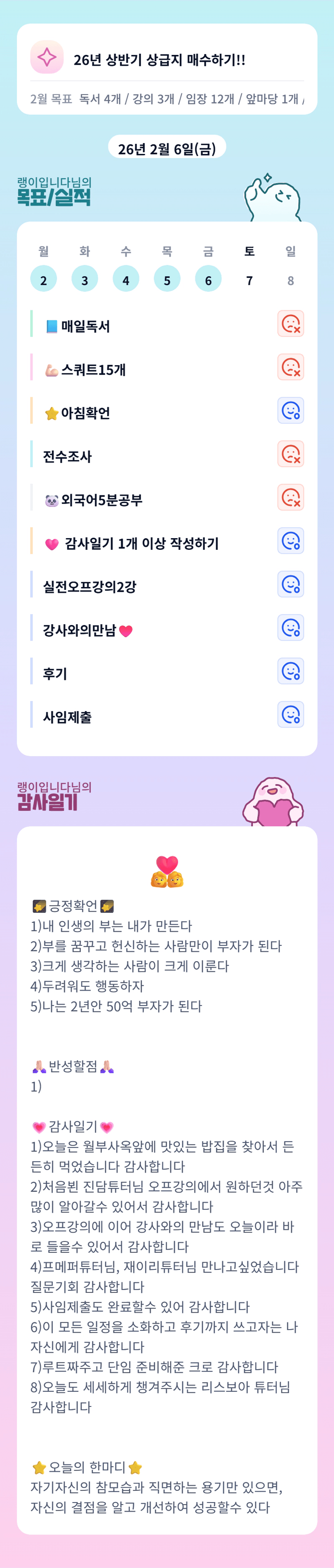 랭이님 오늘 오프다녀오셨군요 ㅎㅎ 감사일기에서부터 기쁨이 느껴집니다 ㅎㅎㅎ 축하드리고 오늘도 고생많으셨어용 매번 단톡방에 좋은 글 올려주셔서 감사합니다 ☺️ 항상 응원합니다 랭이님ㅎㅎ