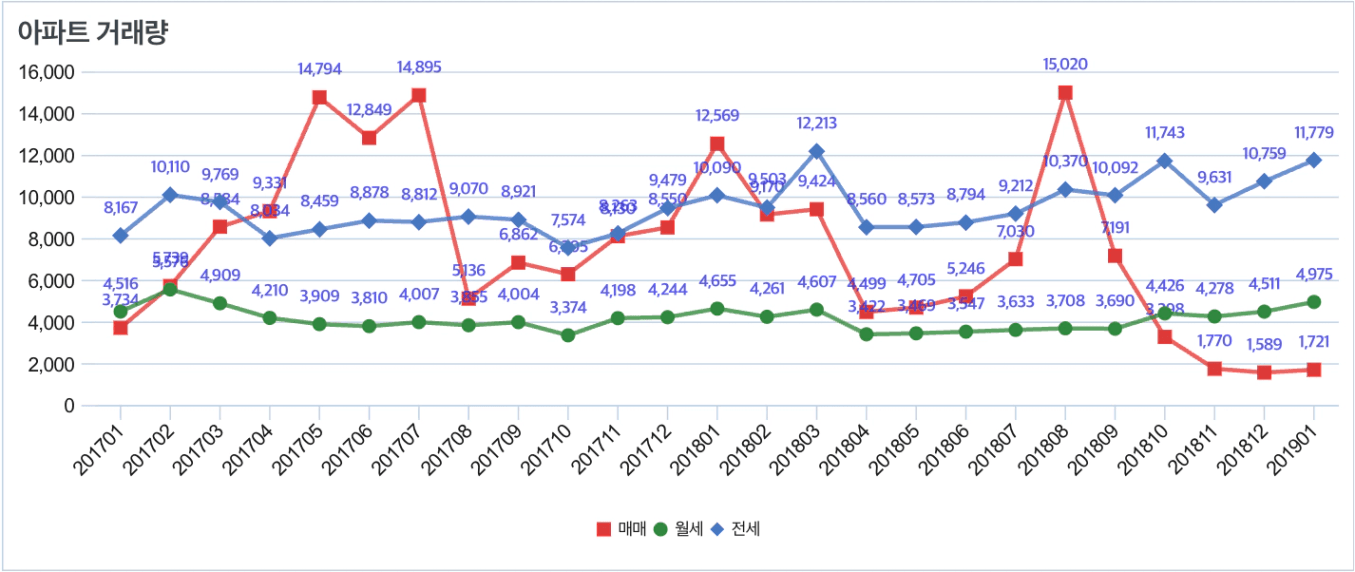 서울 아파트 거래량은 점차 늘어 2018년 1월에는 만2천건까지 육박합니다.