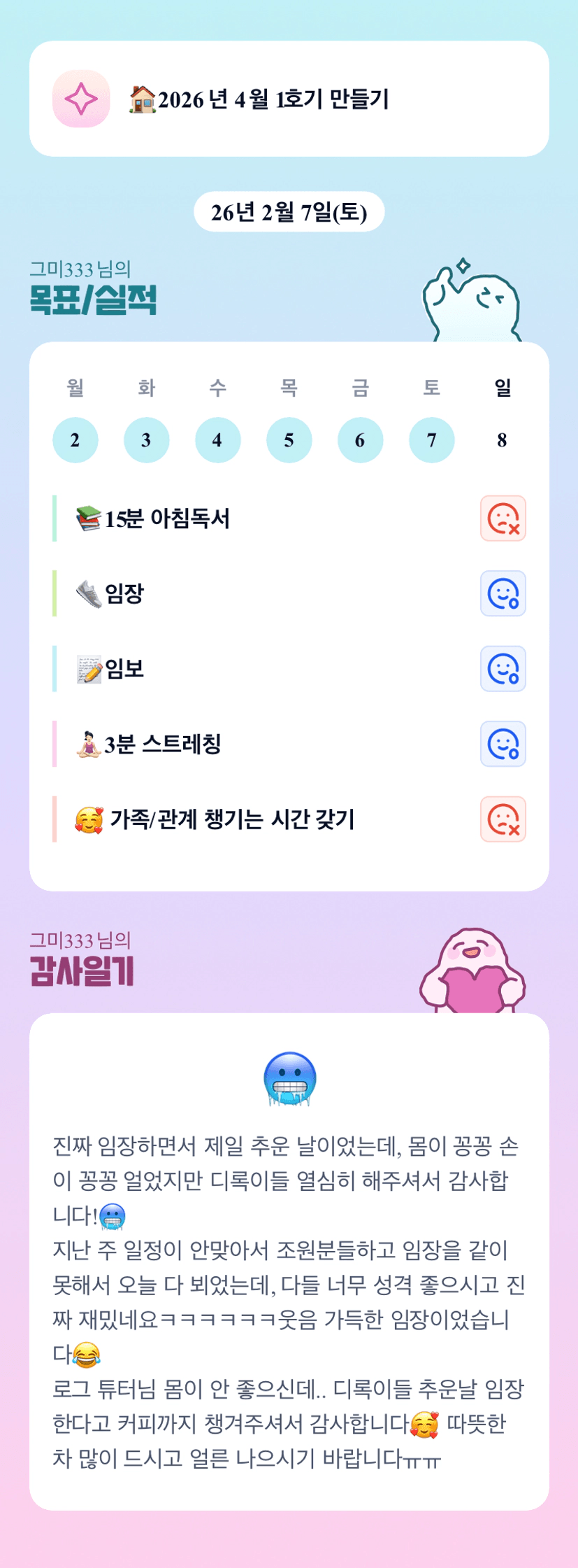 그미님 저 얼어붙은 이모티콘 저랑 다른데 비슷해서 너무 웃겨욬ㅋㅋㅋㅋ진짜 넘 추우셨죠ㅠㅠ극악의 날씨에도 웃음 가득하게 즐겁게 잘 마칠 수 있어 다행입니다💛오늘 튜데도 파이팅이에요 그미님🙌🙌🙌