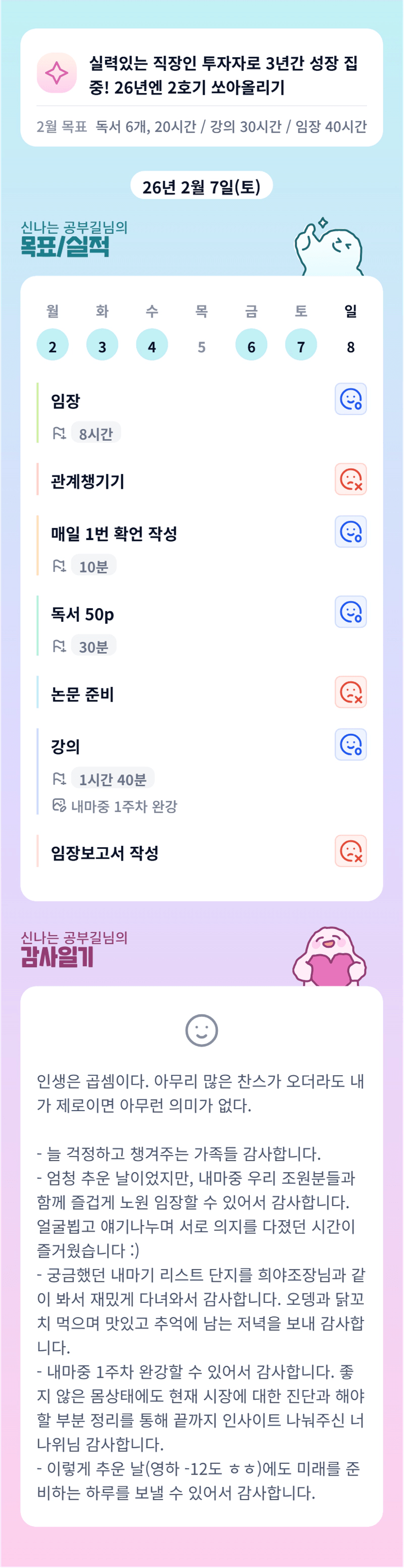 공부길님~어제 많은 경험담과 함께 좋은 생각들 많이 나눠주셔서 감사했습니다,앞으로 한달간도 함께 화이팅입니다!
