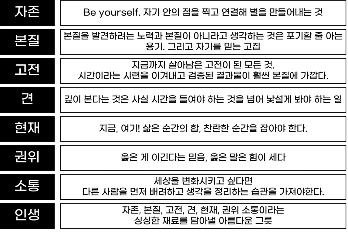 📌인생은 자존, 본질, 고전, 견, 현재, 권위, 소통이라는 싱싱한 재료를 담아낼 아름다운 그릇. 다만 이 단어가 무섭도록 크게 느껴지는 이유는 이 단어 하나만 잘 알아도 세상을 제대로 살아나갈 수 있기 때문이다.