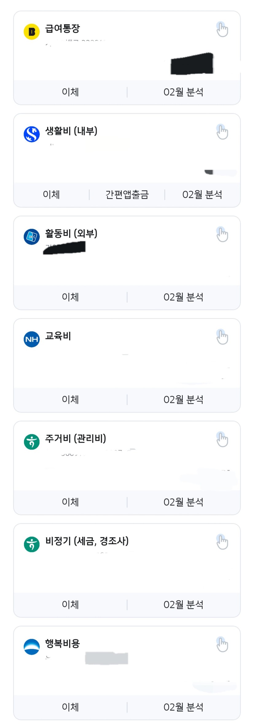 처음에는 카드랑 계좌가 너무 많아져서 복잡 할 것 같았지만, 오히려 더 세분화 해서 사용하면 목적 없이 사용된 비용이 절감 될 것 같다는 생각으로 바뀌었습니다. 요즘엔 하나의 은행어플에서 통합으로 내 모든 계좌를 볼 수 있으니 너무나 좋은 세상인 것 같습니다.