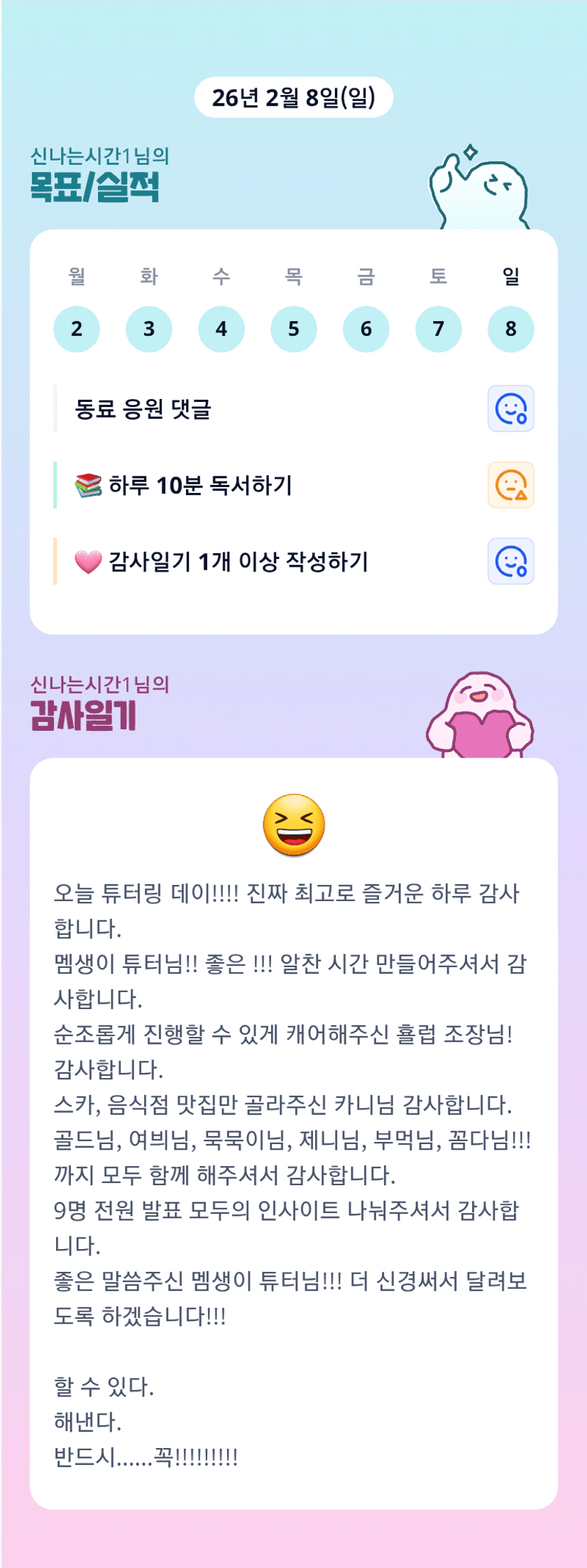 할 수 있다!!!!!!!!! 할 수 있을때까지 시간님은 하실거니까🫶 어제 시간님 덕분에 넘 즐거워떠요:)