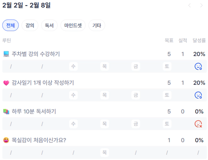 저 비어있는 날과 웃고있지 않은 표정ㅜㅜ 다음주는 꾸준히 작성해보자