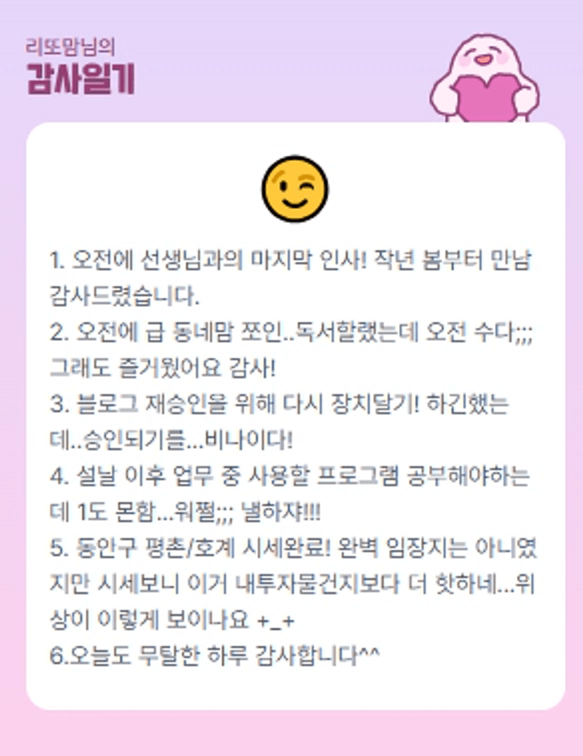 루틴왕~리또님👍👍👍 오호~평촌이 1호기보다 더 핫한가요? 주말 알차게 보내셨네요 팸데이도 하고 좋은분들과 수다타임도 하고 본업복귀 고민도 하시고 멋짐뿜뿜 준비된 리또님💞