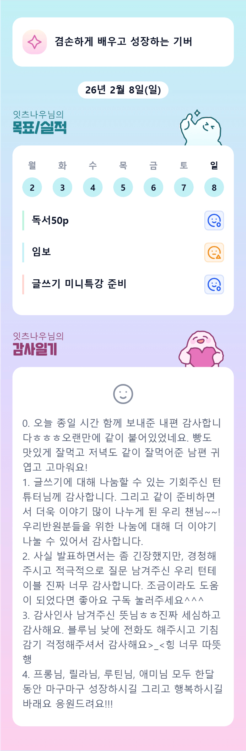 아웅~ 튜터팀 감동😭 안 그래도 오늘 튜터님이야기가? 저의 첫 튜터님💝 나우즈 1기 부심 뿜뿜!! 튜터님도 건강챙기시면서 화이팅입니다!