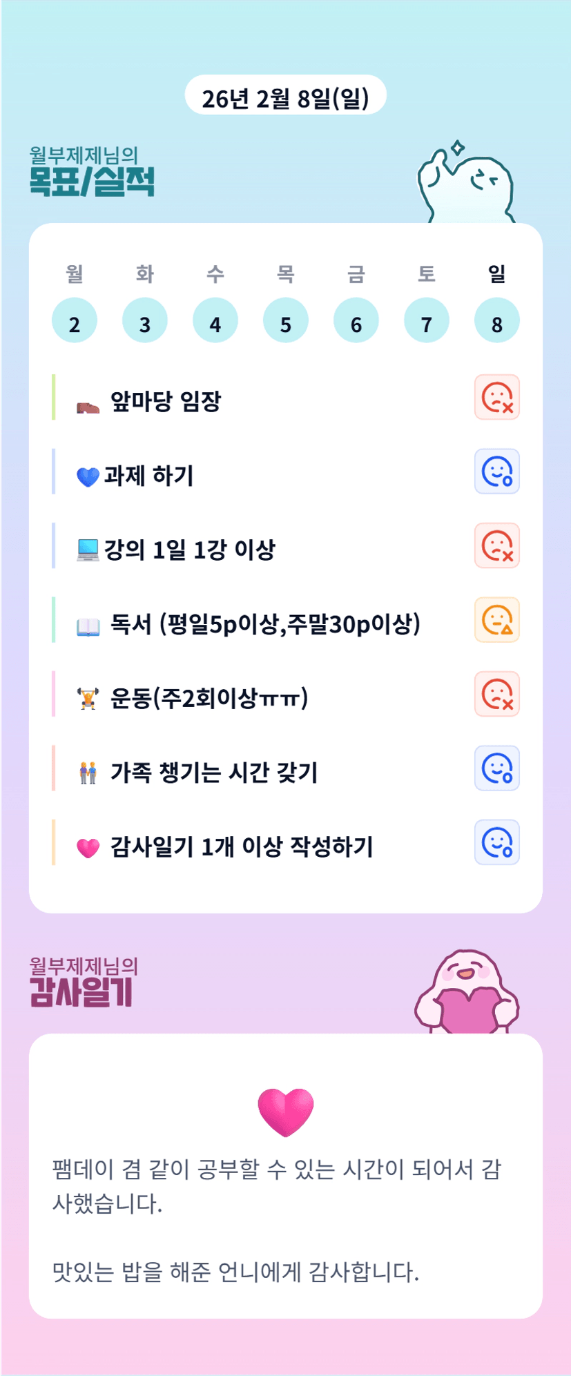 제제님! 페밀리데이인데 많이 달성하셨네요! 대단합니다. 앞으로도 함께 힘내보아요!!🔥🔥