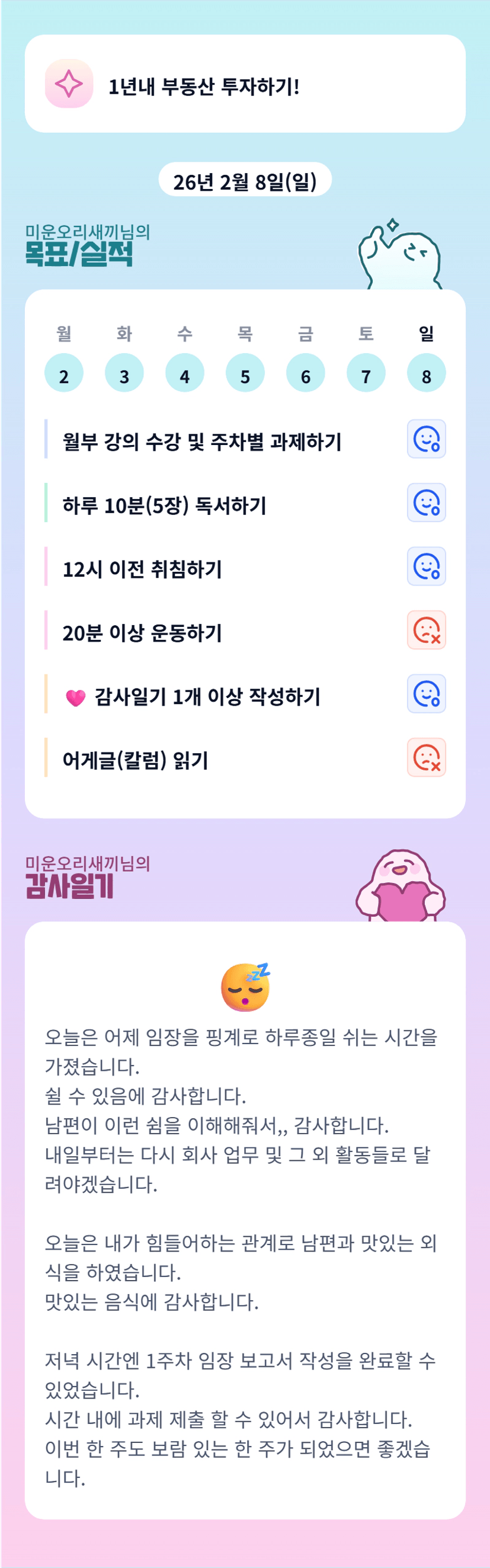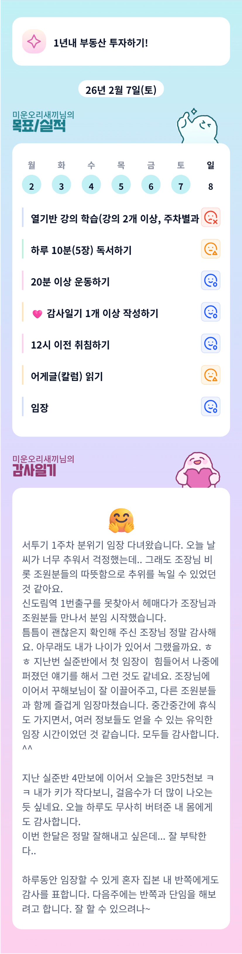 오리님! 임장 끝까지 해내시는 모습이 정말 멋지다고 느꼈어요! 1주차 임보도 벌써 제출하셨다니 최고최고! 이번주 컨디션 회복 잘 하셔서 주말에 임장 화이팅이에요!