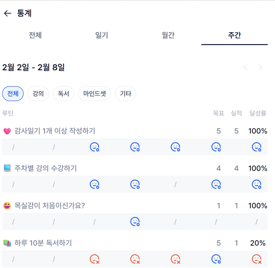 2월 4일부터 8일까지 5일간 목실감을 작성해보았습니다. 목표했던 강의 수강과 과제를 원활하게 마무리할 수 있어 소기의 성과를 거둘 수 있었습니다.