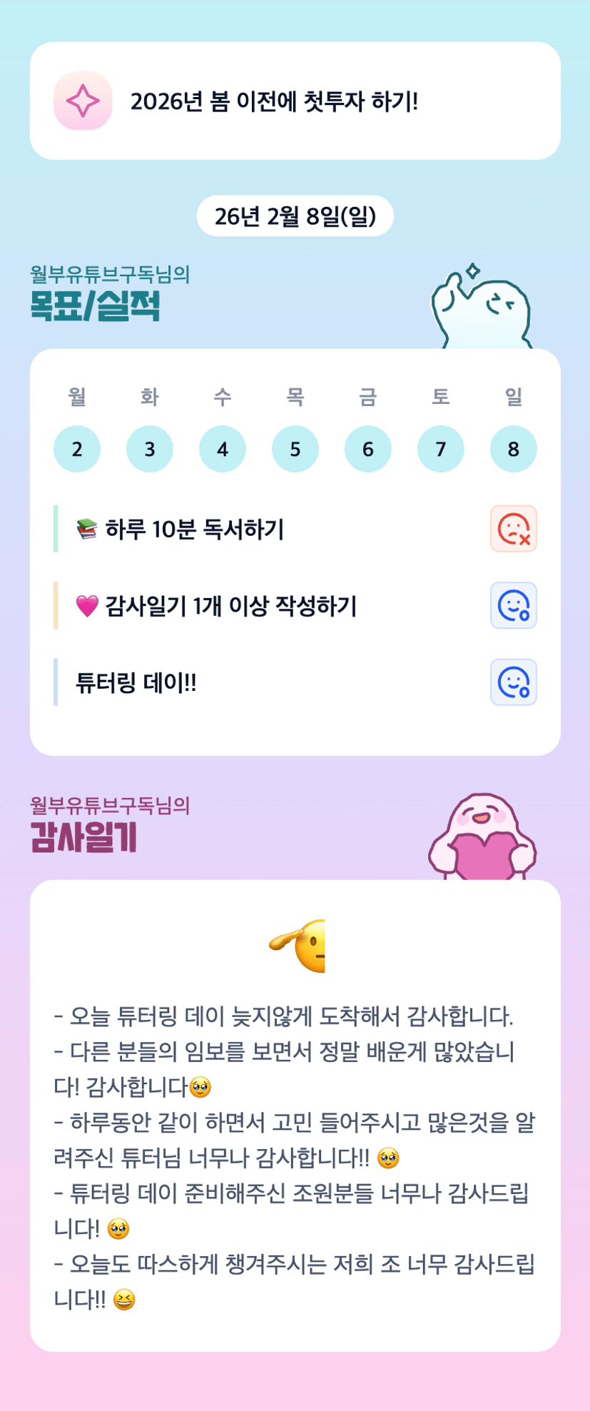 구독님 튜터링데이 고생하셨어요💓 둘리 조장님과 같은 조이시군요 대박대박 가쥬아아💗